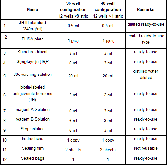 This kit uses a biotin double antibody sandwich enzyme-linked immunosorbent assay (ELISA) to determine the level of insect juvenile hormone (JH) in the sample. Add juvenile hormone (JH) to the pre-coated polyclonal antibody (recognizing JH I/JH II/JH III) and incubate; after incubation, add biotin-labeled anti-juvenile hormone (JH) antibody, and then combined with streptavidin-HRP to form an immune complex, then incubate and wash to remove unbound enzymes, and then add substrates A and B to produce blue color, which is converted into the final yellow. The intensity of the color is positively correlated with the concentration of insect juvenile hormone (JH) in the sample.